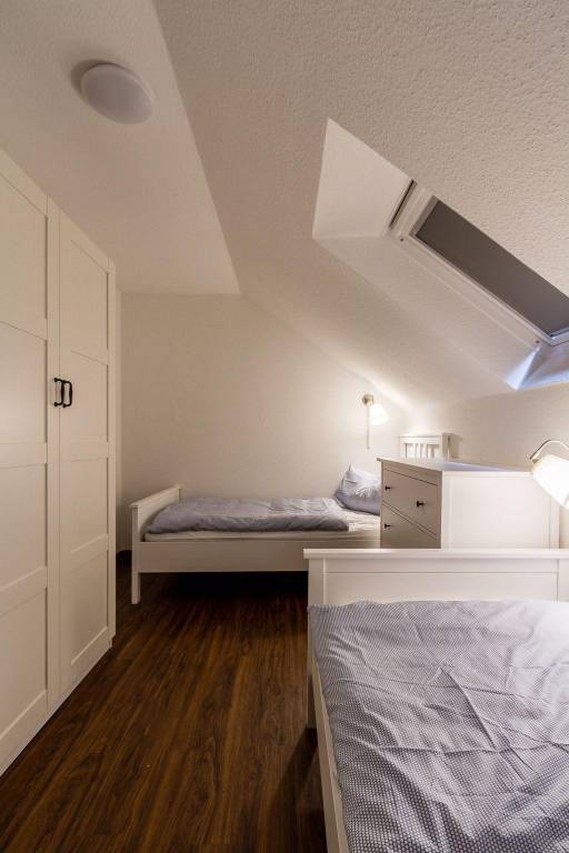 Im Obergeschoss finden sich zwei Schlafzimmer: eines mit einem Doppelbett (2 Matratzen, 90x200 cm) und eines mit zwei Einzelbetten (je 90x200 cm). Beide Schlafräume sind mit Veluxfenstern und Verdunkelungsrollos ausgestattet. Ein Kinderhochstuhl und ein Reisebett stehen bereit, und ein PKW-Stellplatz ist ebenfalls vorhanden. Bettwäsche muss mitgebracht werden. Ein Hund ist gegen Gebühr willkommen.