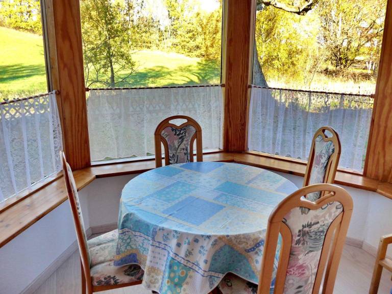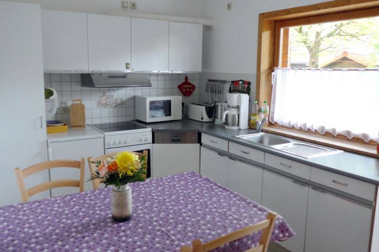 Der Frühstücksraum befindet sich im Turmzimmer. Die Wohnküche ist ausgestattet mit E-Herd, Backofen, Kühlschrank, Mikrowelle, Geschirrspülmaschine und vielen weiteren Kochutensilien.