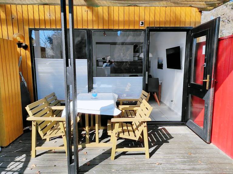 Die Wohnung verfügen über einen gemütlichen überdachten Sitzbereich, so dass Sie auch bei Regen in Ruhe frühstücken und die Natur geniessen können. Sie haben einen tollen Blick auf den grossen Garten und sehen ihren Nachbarn nicht bzw.selten :)