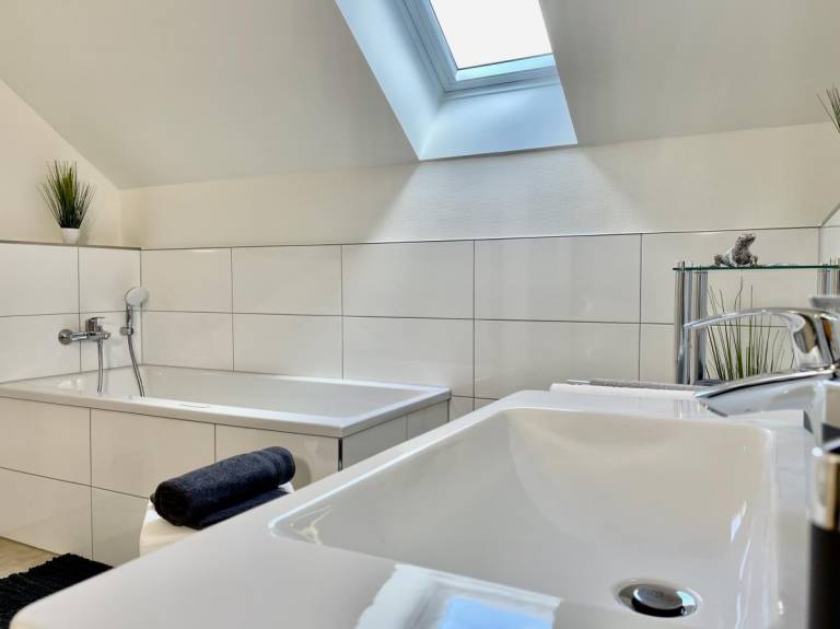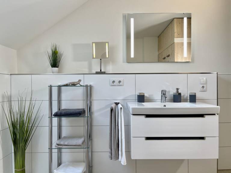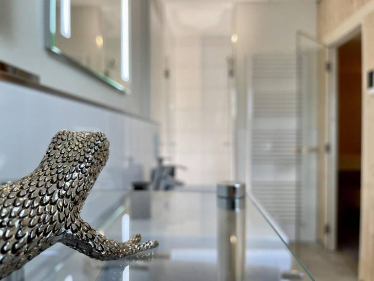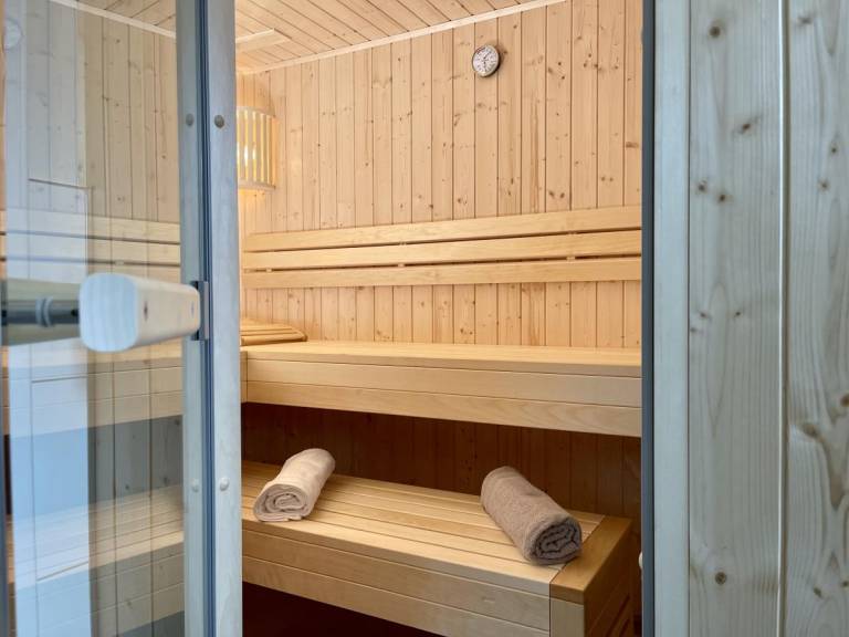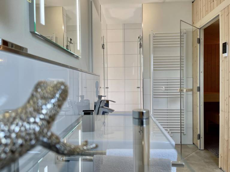 Das Bad, mit eigener Sauna, großzügigem Duschbereich und Whirlwanne ist darauf ausgerichtet, entspannte Wellness-Momente in Privatsphäre zu geniessen.
