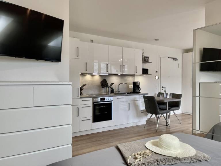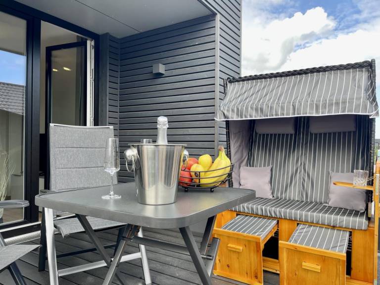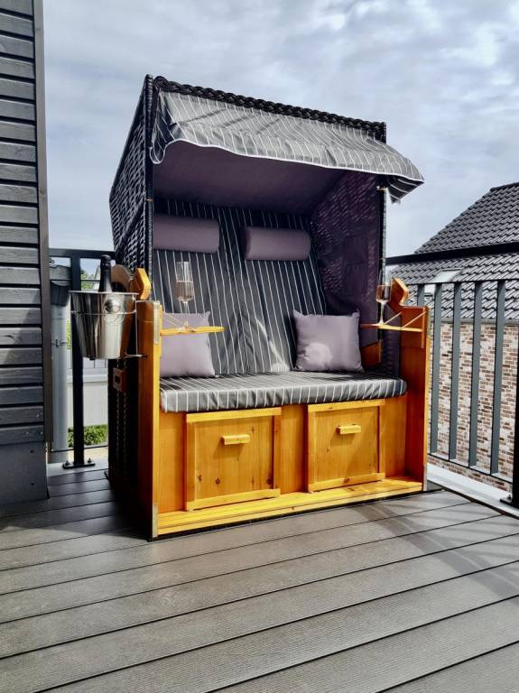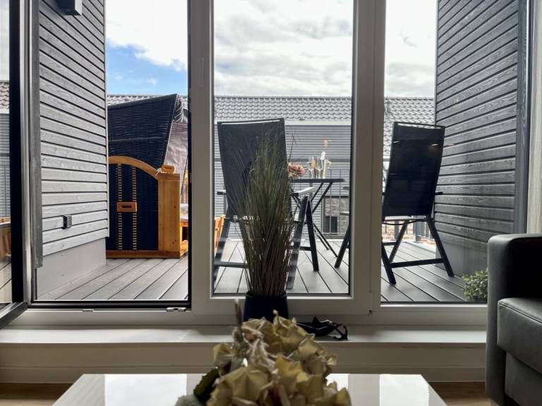 Schlafen, der Wohn-/Essbereich, die Küche und der Zugang zur geschützten Dachterrasse mit eigenem Strandkorb - alles ist offen, frisch und sehr wertig gestaltet.