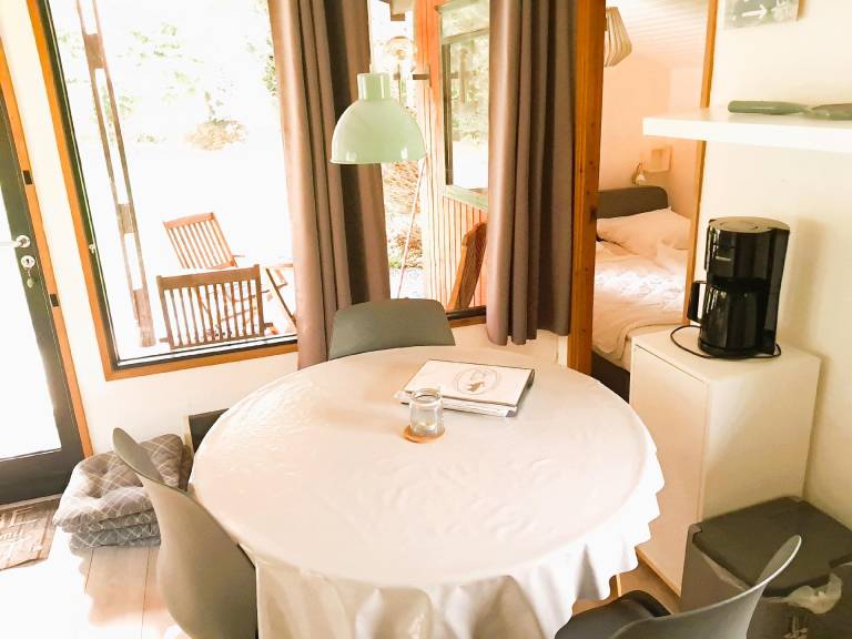 Die Objekte verfügen über einen gemütlichen überdachten Sitzbereich, so dass Sie auch bei Regen in Ruhe frühstücken und die Natur geniessen können. Sie haben auch einen eigenen Garten und sehen ihren Nachbarn nicht bzw. je nach Haus selten :)