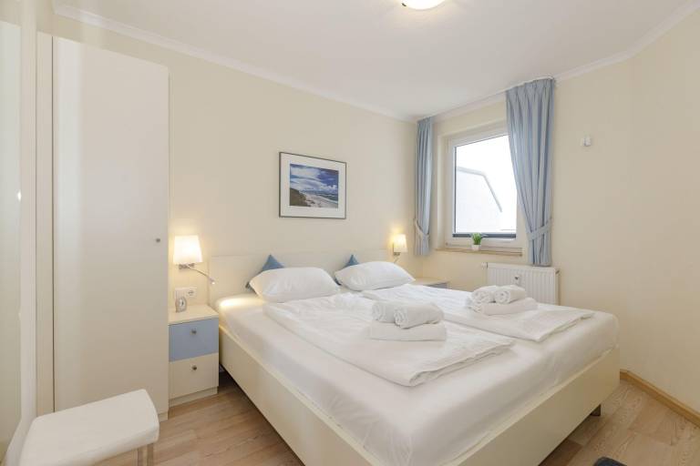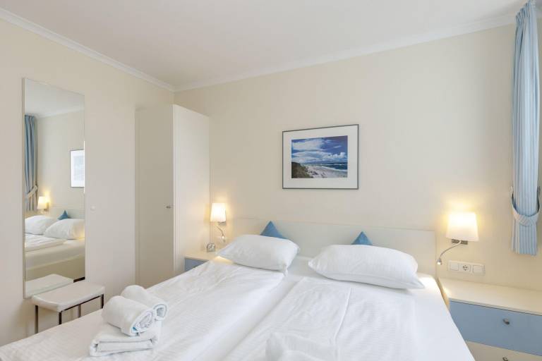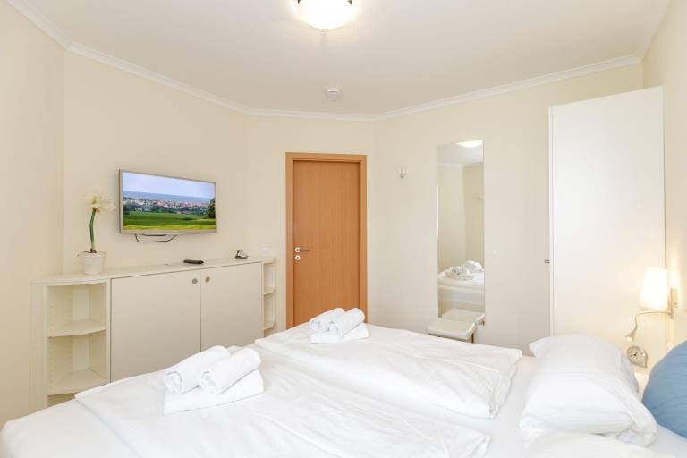 Das separate Schlafzimmer ist mit einem zweiten TV-Flachbildschirm und einem bequemen Doppelbett eingerichtet. Ausstattung und Farbgebung sorgen für einen geruhsamen Schlaf. Für Ihre Urlaubsgarderobe stehen Ihnen ausreichend Kleiderschränke zur Verfügung.