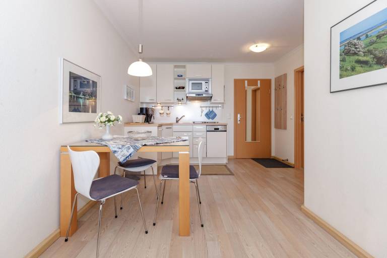 Der geschmackvoll gestaltete Essbereich grenzt an die Küchenzeile, die voll ausgestattet ist. Alle modernen Geräte sowie weitere Küchenutensilien sind vorhanden, schnell sind Ihre Lieblingsmahlzeiten angerichtet.
