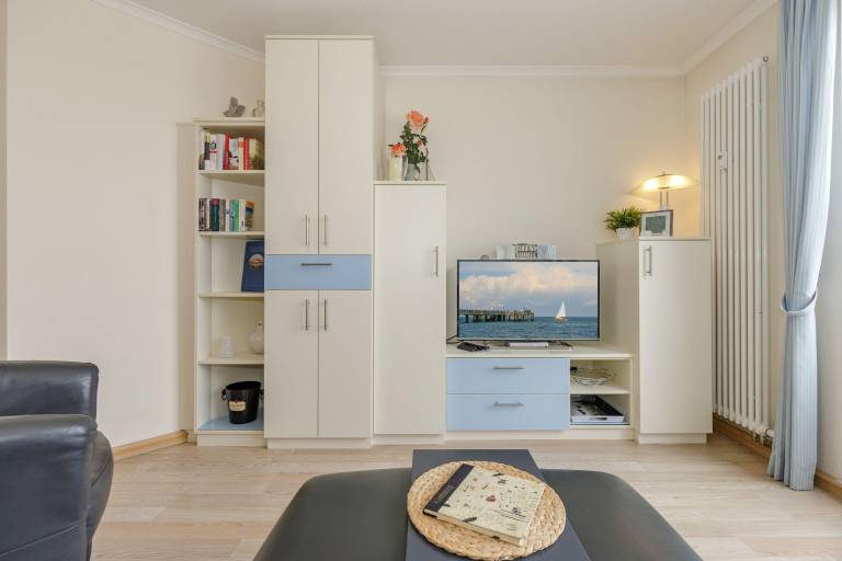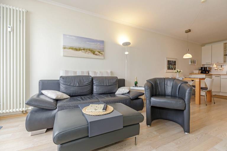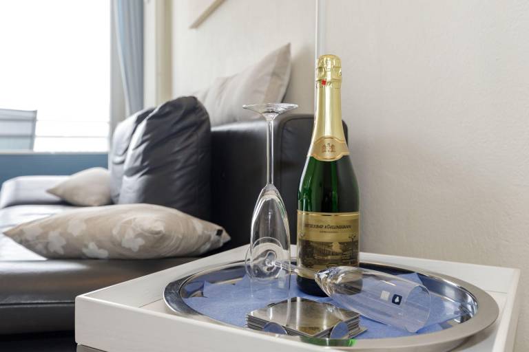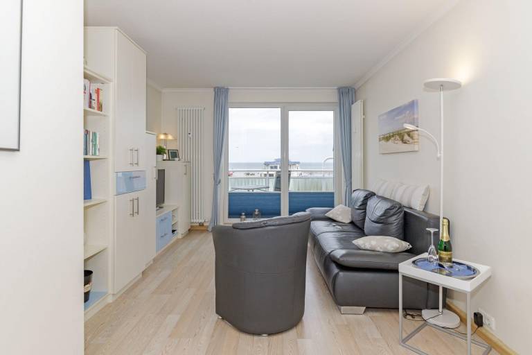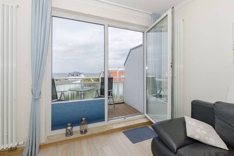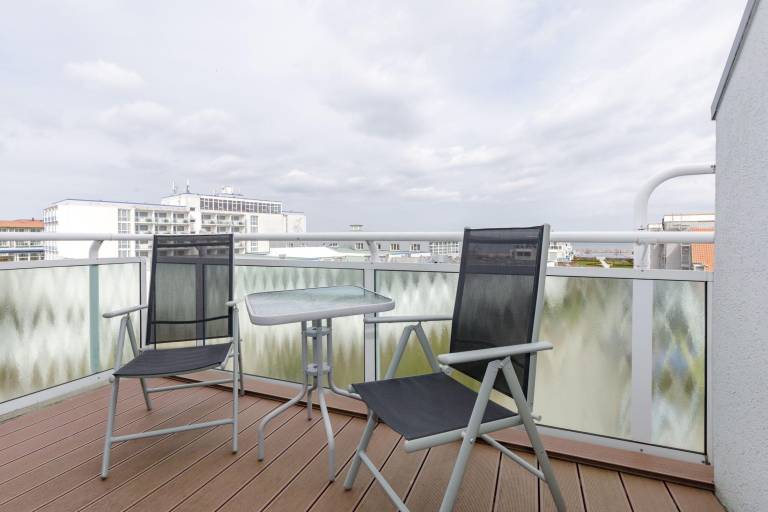 Vom windgeschützten, nach Nord-West ausgerichteten Balkon genießen Sie einen fantastischen Blick auf die Ostsee. Hübsche Balkonmöbel laden zum Verweilen ein, hier können Sie die Seele baumeln lassen und den Alltagsstress schnell vergessen. Und am Abend gemeinsam einen ereignisreichen Tag bei einem Lieblingsgetränk gemütlich ausklingen lassen - Urlaubs-Feeling pur!