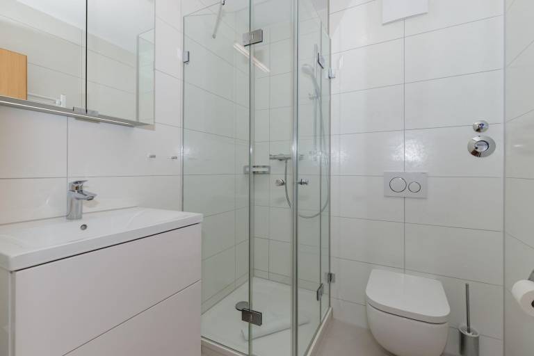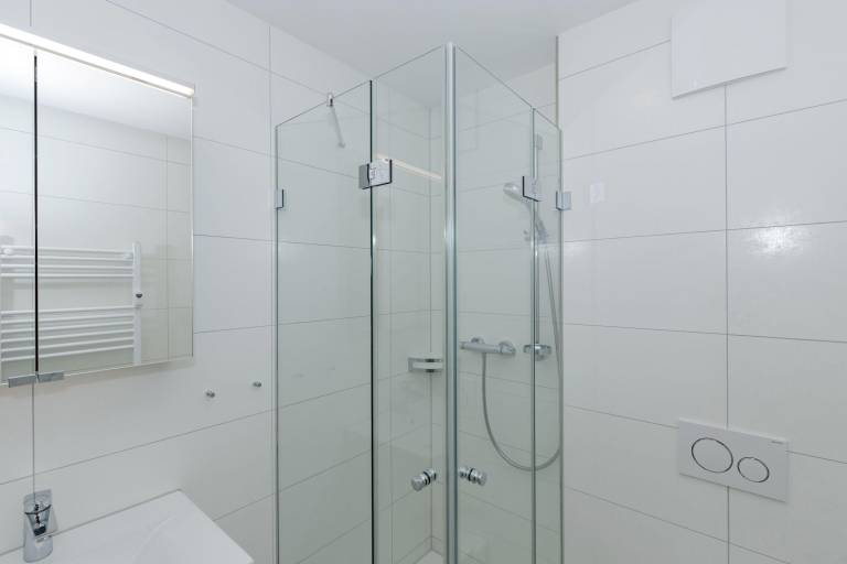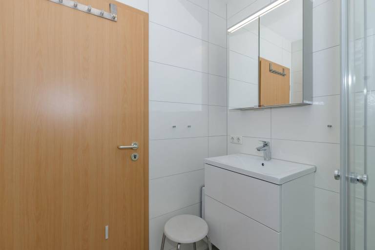Das Badezimmer ist mit einer Dusche, einem Waschbecken mit Unterschrank für Ihr Badutensilien, einem WC, einem Handtuch- Heizkörper, Föhn und Kosmetik-Spiegel ausgestattet.