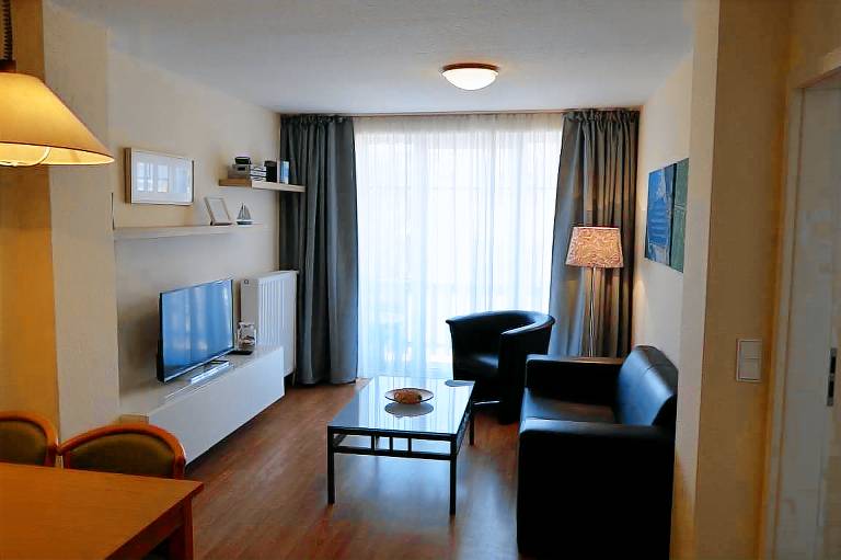 Vom Wohnbereich aus gelangen Sie auf den gemütlichen Balkon, der mit modernen Balkonmöbeln ausgestattet ist. Hier können Sie einen ereignisreichen Urlaubstag gemeinsam bei einem leckeren Getränk ausklingen lassen.