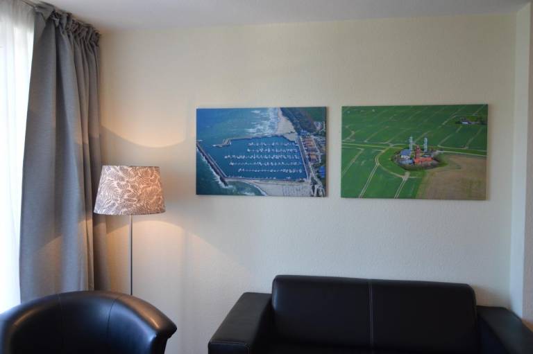 Der sehr modern eingerichtete Wohnbereich ist mit einem hochwertigen Sofa und einem Sessel ausgestattet. Ein Flachbildschirm-TV sorgt für Ihre abendliche Unterhaltung.