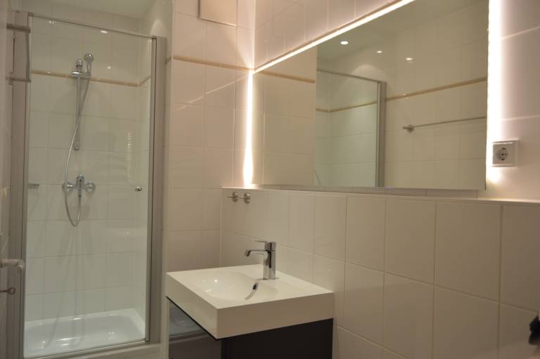 Das Badezimmer ist mit einer Dusche, einem Waschbecken und einem WC ausgestattet.