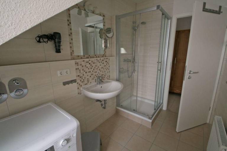Die Wohnung verfügt über ein modernes Duschbad mit Waschmaschine sowie Trockner. Alle Räume sind separat begehbar. Die Fenster (bis auf Gauben) sind für eine Verdunkelung mit Außen-Rollläden ausgestattet. Alle Räume besitzen Fußbodenheizung.