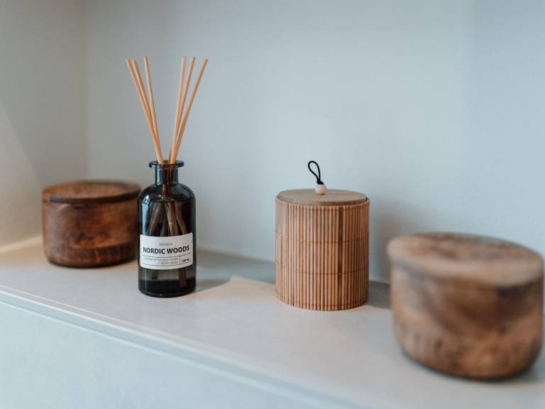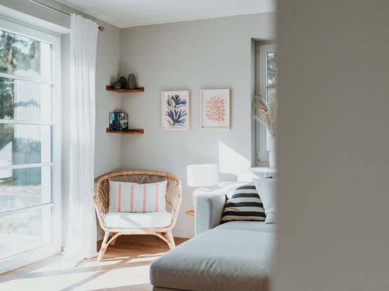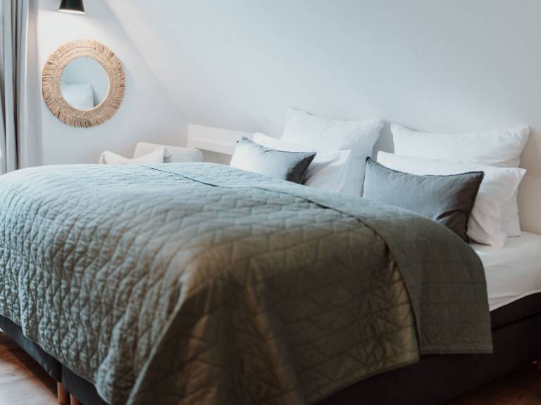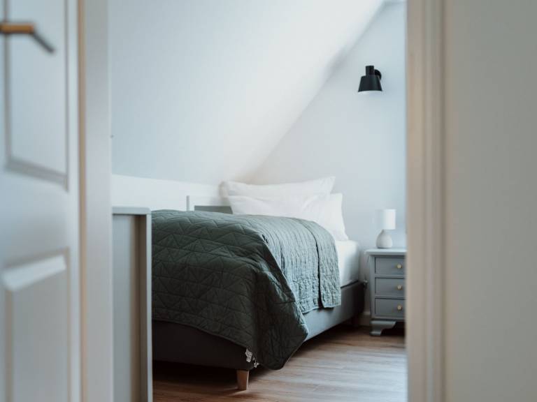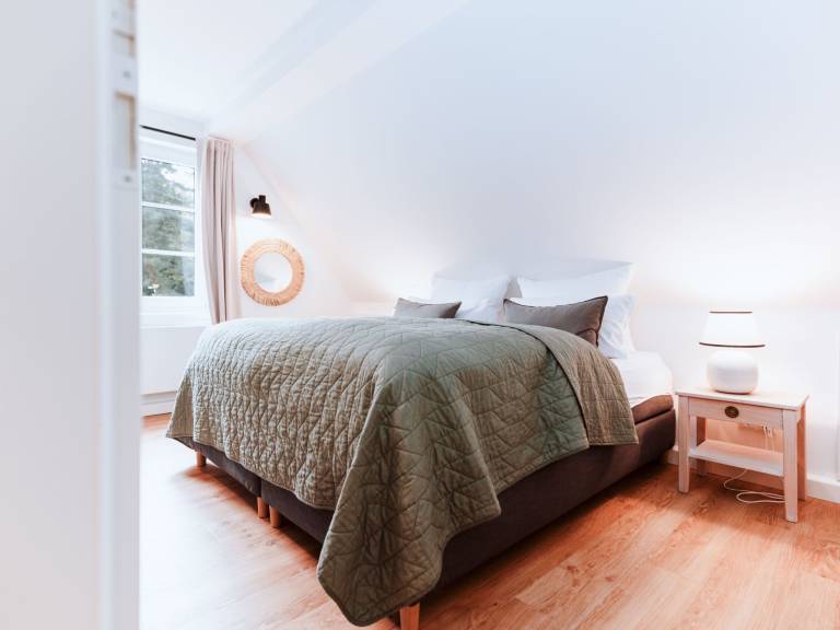 Das Haupthaus verfügt über 2 Schlafzimmer, die komfortable Boxspringbetten für 4 Personen bieten (1 x 180 cm, 2 x 90 cm).Zusätzlich kann das Schlafsofa im Wohnzimmer ausgezogen werden (Achtung: Raum nicht abdunkelbar!).Die beiden Badezimmer verfügen je über eine große Walk-in Regendusche, sowie eine Fußbodenheizung.In der offenen Wohn-Küche kann auf einem 4-Feld Indusktionsherd gekocht werden. Spülmaschine, Kühlschrank mit kleinem Gefrierfach sind ebenfalls vorhanden.