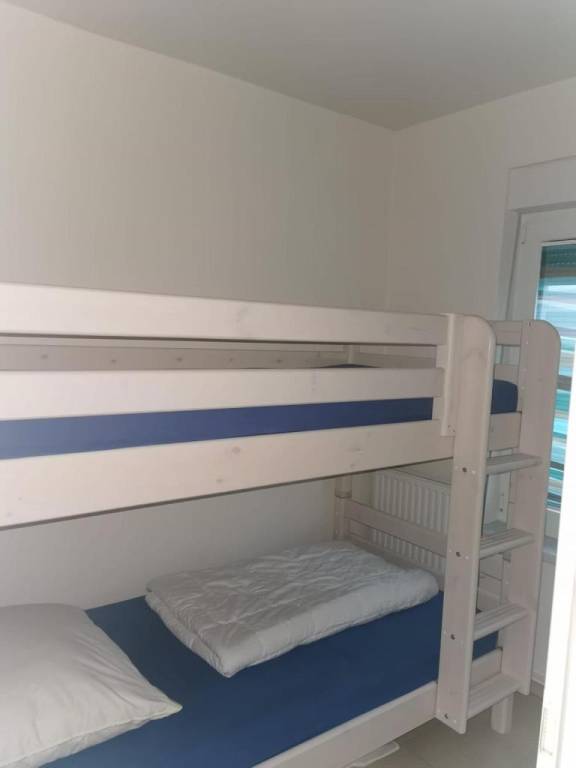 Das Schlafzimmer ist mit einem 1,60 breiten Bett ausgestattet und bietet zusätzlich einen Fernseher. Ein separates Kinderzimmer mit Doppelstockbett sorgt für Rückzugsmöglichkeiten und ausreichend Platz. Stauraum ist durch vorhandene Schränke gegeben.
